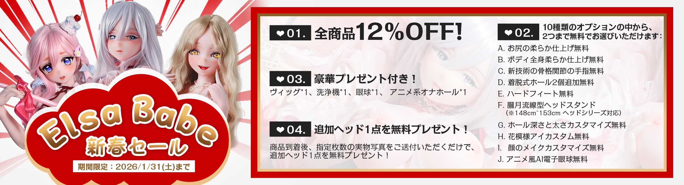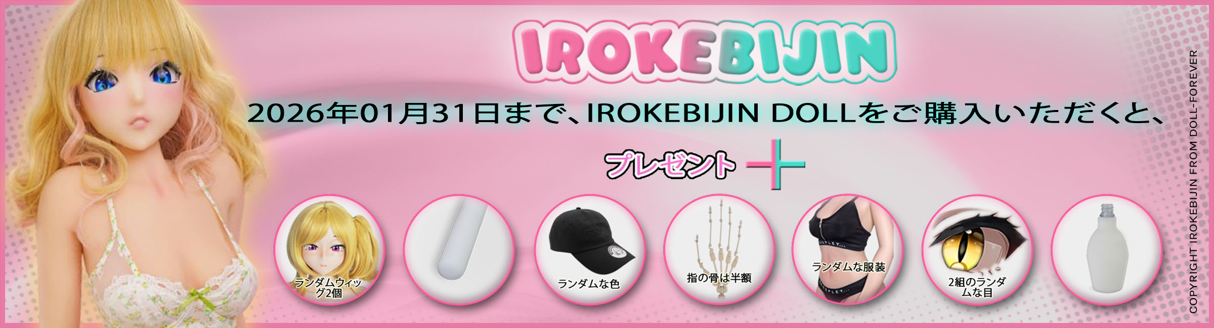 1月31日迄 色気美人期間限定キャンペーン「ランダムカラーの帽子|ランダムウィッグ×2|ランダムアイ×2セット|ランダム衣装|除湿棒|洗浄器|を無料でプレゼント!」が開催中!!